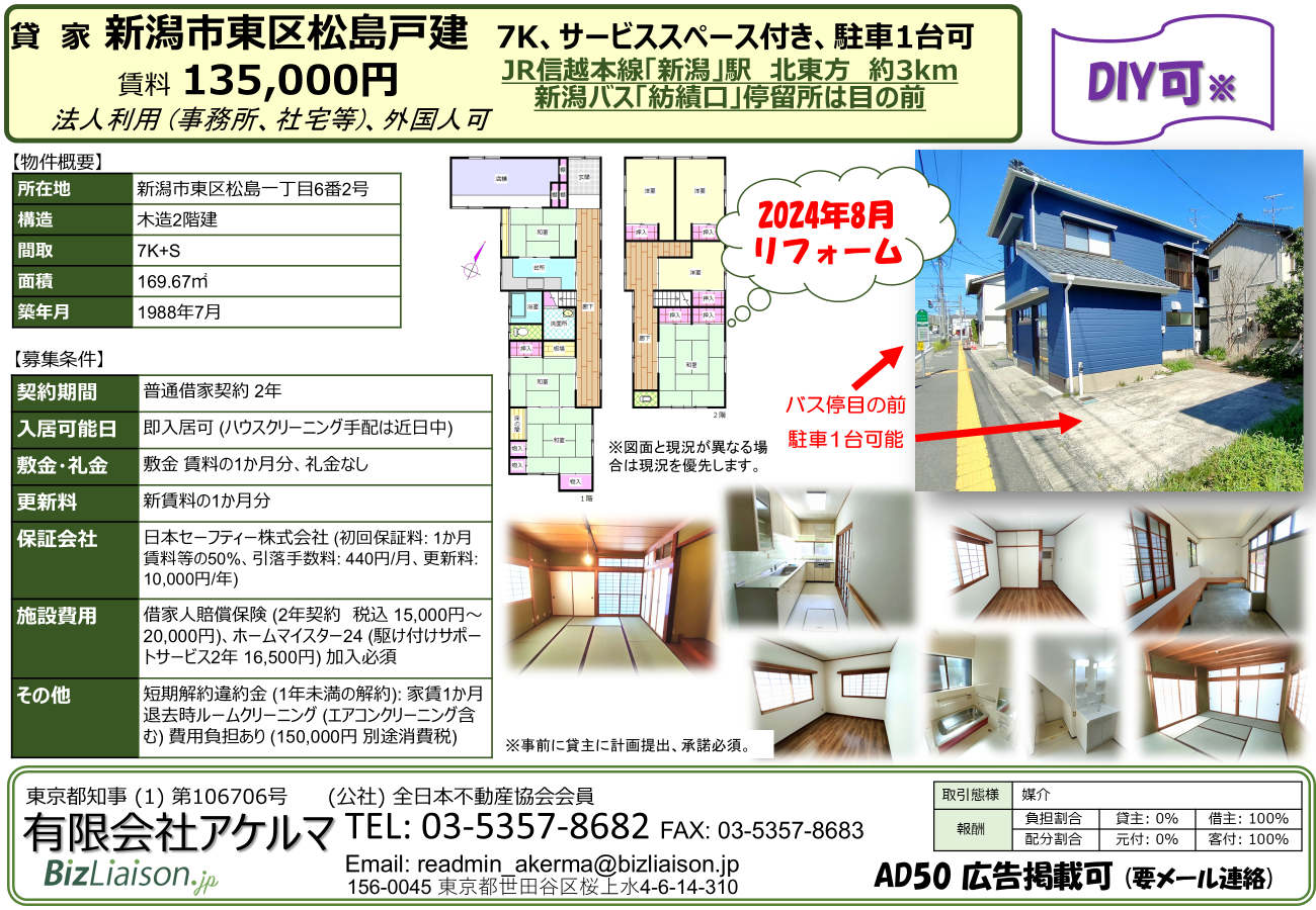 | Note | 賃貸条件の詳細は、弊社 (03-5357-8682) までご連絡ください / Please contact us (+81 3 5357 8682) for details. 法人契約希望 (corporate contract is preferred) 賃貸物件 (Lease Property) 家賃/ Monthly rent: 168,000円 敷金/ Security deposit: 168,000円 礼金/ Key money: 0円 2年の普通賃貸借契約/ Regular lease agreement for 2 years 保証会社加入必須/ Required to apply for rent guarantee company plan 初回保証料: 1か月家賃等の50% / 50% of 1-mont rent, etc. - JR信越本線「新潟」駅 北東方約3km (~3km from Niigata Station on JR Shinetsu Honsen Line; 新潟バス「紡績口」停留所は目の前 (Bosekiguchi bus stop in front of the house) -リフォーム2024年8月 (Renovation work completed in August 2024) ハウスクリーニング前の内覧可能 (Viewing can be arranged before house cleaning) |